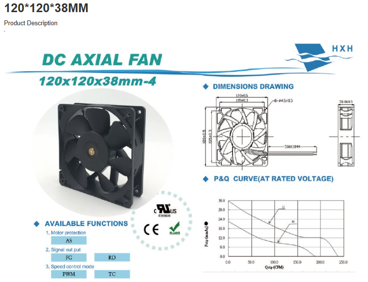 Specifications 1.size(mm):120X120X38 2.rated voltage: 12V ,24V,48V 3. Material: Frame: Metal; Impeller: Plastic 4. Package: 40PCS/Carton