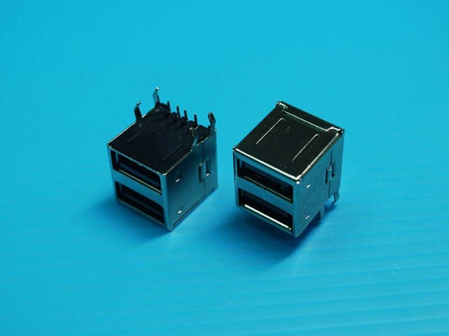 USB2.0 A Type 4+4Pins Receptacle Stacked Type DIP Gold Flash Plating With Full Shielding Without Spring Black Color